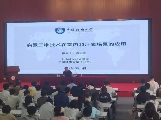 随后,中国地质大学(北京)康志忠教授作了题为《实景三维技术在室内和月表场景中的应用》的学术报告,介绍了实景三维数据产品、室内实景三维模型应用、实景三维在各类场景中的应用,并讲解了载人探月系统方案—月球测绘遥感卫星规划,最后提出了如何解决几何-语义-应用的跨越以打通室内和月表实景三维实际应用的最后一公里问题的展望。康志忠教授精彩的报告,让测绘工程专业师生更清晰地认识到三维实景模型高精度、高分辨率、高清晰度的特点以及使用专业软件进行三维重建,制作地物的三维实景模型的技术应用,为今后深入学习专业知识、探索高新技术等奠定了基础。